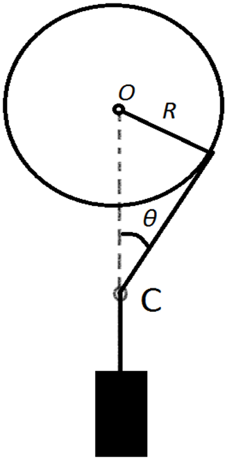 Система состоит из однородного массивного блока радиусом R = 150мм, на который намотана нить с грузом на конце. Нить перекинута через гладкий горизонтальный стержень C, укрепленный на стене. В момент t = 0 груз отпустили, и система пришла в движение. Найти момент импульса системы относительно оси О блока через t = 4.0 с после начала движения, если в процессе движения нить давит на стержень C с постоянной силой F = 50 Н. Угол ϑ = 〖60〗^0.
