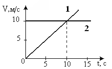 1. На рисунке изображены графики зависимости скорости от времени для двух тел, движущихся вдоль одной прямой. Второе тело догонит первое через … секунд. [img][/img]