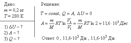 Азот массой m=200 г расширяется изотермически при температуре T=280 К, причем объем газа увеличивается в два раза. Найти: