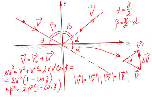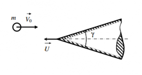 А удар упругий или нет. Как искать модуль импульса силы, если неизвестен способ взаимодействия шара и конуса. я бы связал систему отсчета с конусом, так его импульс имеет бесконечное значение и работать с ним нельзя и рассмотрел бы задачу об ударе шара о стену под углом \(\beta=\frac{\pi-\gamma}{2}\)
