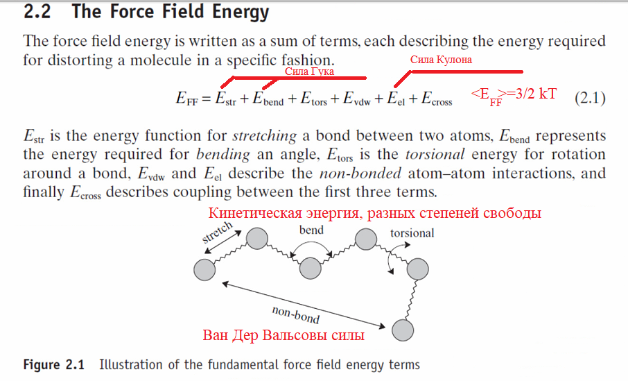 Эти две силы порождают энергию колебатильного движения, вращательного движения(сгибательного и торсионного) и энергию Ван Дер Вальсовы далее, что бы не путать \(E_{VDW}\).