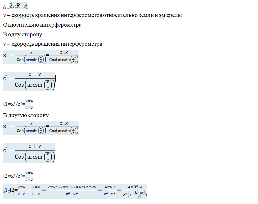 Я использую Ваше преобразование x' = (x-vt)/(1-v2/c2)1/2 . Встречным сигналам придется пройти один и тот же путь L=2пR. Знаком + я обозначу скорость света в направлении вращения и, соответственно, (-) означает обратное направление. В таком случае скорость света в направлени вращения c'+ = (c-v)/(1-v2/c2)1/2 и скорость в противоположную сторону c'- = (c+v)/(1-v2/c2)1/2. На полный оборот по периметру интерферометра оба луча затратят время t+=2пR (1-v2/c2)1/2/(c-v) и t-=2пR (1-v2/c2)1/2/(c+v). Вычисляем разницу затраченных времен t+ — t- = 4пRv/{c2(1-v2/c2)1/2}. Вместо v Вы используете произведение радиуса на угловую частоту. Нетрудно видеть разницу между моей формулой и Вашей. У меня в знаменателе стоит корень из релятивистского фактора, а у Вас это выражение без корня. Да, и при Ваших преобразованиях с точки зрения системы интерферометра будет возникать интерференция. Одако (!) выражения для временной задержки встречных сигналов разные. Ваши преобразования создают ту же проблему, что и преобразования Лоренца. Это говорит о противоречии Ваших преобразований с действительностью. Правильным результатом является тот, который получен из неподвижной системы координат.