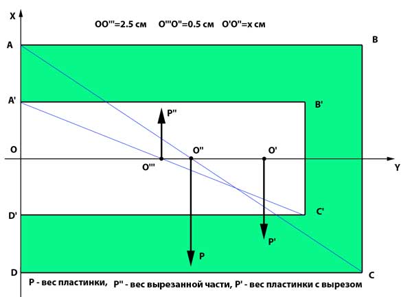 Пусть искомый центр тяжести пластинки с вырезом лежит в точке O'.