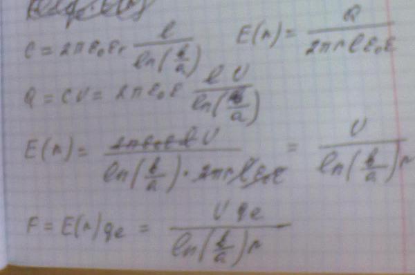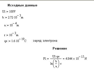 Электроды двухэлектродной лампы имеют форму нити радиуса а = 0,100 мм (катод) и коаксиального с ней цилиндра радиуса b = 2,72 мм (анод). На электроды подано напряжение U = 100 В. Определить силу, которая будет действовать на электрон, находящийся на расстоянии r = 1,00 мм от оси катода.