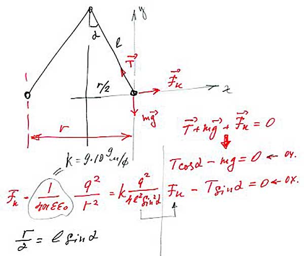 2) Два маленьких шарика с одинаковыми радиусами и массой подвешены на двух нитях так, что их поверхности соприкасаются. Какой заряд нужно сообщить шарикам, чтобы натяжение нитей стало равно 0,098 Н? длинна нитей 20см, а масса шариков по 5 г