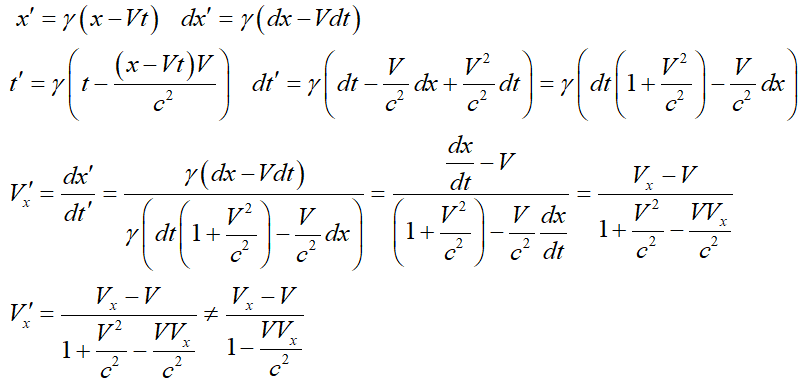 Проверка показала, что формула сложения скоростей выведенная из уточненного преобразования скоростей противоречит второму постулату СТО, согласно которому \(V'_x=\Large\frac{V_x-V}{1-\frac{V_xV}{c^2}}=\frac{c-V}{1-\frac{cV}{c^2}}=\frac{c-V}{1-\frac{V}{c}}=c\).