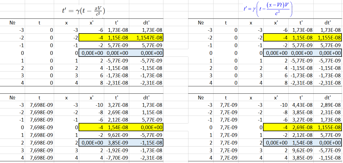 Молчанье — знак согласия. Рассмотрим, сохраняются ли результаты световой синхронизации в начальный момент в дальнейшем? Для этого сравним значния погрешности световой синхронизации, рассчитанные по формулам \(dt'=-\gamma(\frac{xV}{c^2})\) и \(t'=\gamma(t-\frac{(x-Vt)V}{c^2})\), для двух моментов времени \(t_0=0\) сек  и \(t_2=7,698E-09\) сек.