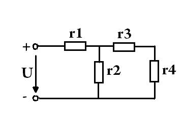В схеме ток в резисторе r5 равен 2,5А. Определить напряжение источника U при r1=10 Om, r2= 20 Om, r3=12 Om, r4=8 Om