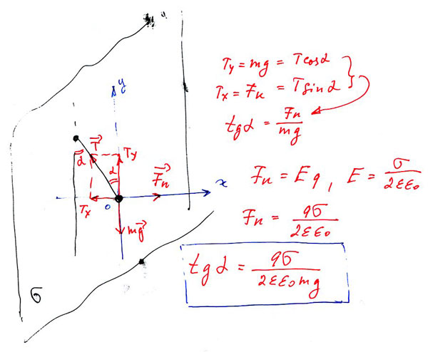 Записываем равновесие проекций сил на оси координат: Т*cosa=mg T*sina=F F- cила Кулона. Т- сила натяжения нити. mg- вес.