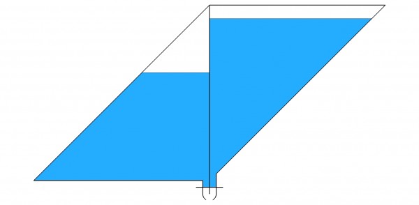 Пусть имеются два плоских сосуда, расположенных так, как показано на рисунке, и соединённые, в начале перекрытой, трубкой. Сосуды содержат одинаковые объёмы жидкости.