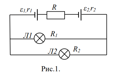 В цепи на рис. 1 ЭДС источников тока Ɛ1= Ɛ2=12 В, их внутренние сопротивления r1 = 2,4 Ом, r2 = 1,6 Ом, сопротивление резистора R = 20 Ом, сопротивления лампочек Л1 и Л2 соответственно R1 = 40 Ом, R2 = 60 Ом. Используемый в цепи амперметр считать идеальным. Найти токи, текущие через лампочки. Ответ: 0,3 А, 0,2 А.