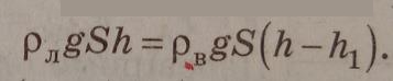 \(\rho _лgSh=\rho _вgS\left ( h-h_1 \right ) \\\rho _лh=\rho _в\left ( h-h_1 \right ) \\\frac{\rho _л}{\rho _в}h=h-h_1 \\h_1=h-\frac{\rho _л}{\rho _в}h=\left ( 1- \frac{\rho _л}{\rho _в} \right )h\)