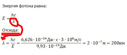 Написано — «ЭНЕРГИЯ ФОТОНА РАВНА...»… и дальше — «ОТСЮДА»… т.е из формулы энергии фотона находят ДЛИНУ ВОЛНЫ ФОТОНА, длина в метрах измеряется.