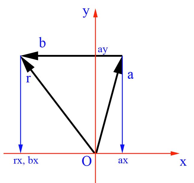 Дорисуйте вектор r. Проекция вектора r на оси координат равна сумме проекций данных векторов на соответствующие оси.