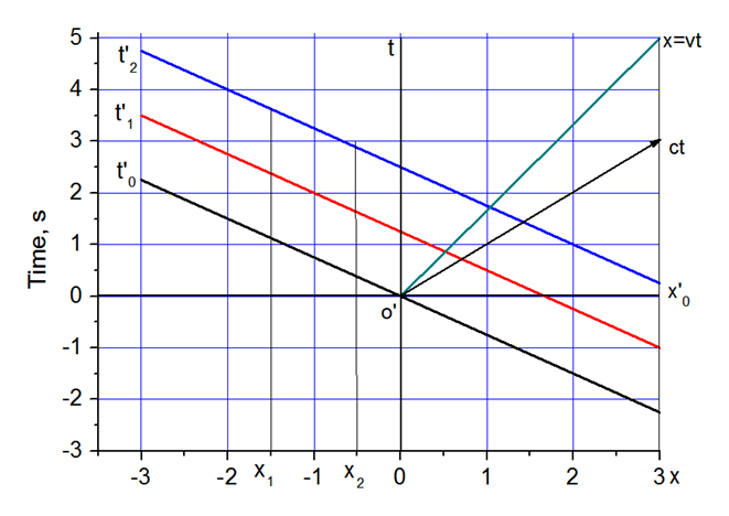Нетрудно видеть, что при постоянном t в разных точках x значения времени движущейся СО всегда различны. В точках пересечения временных осей системы K’ c линиями постоянного t  имеет место одновременность событий в движущейся СО. Но эти одновременные события в движущейся СО оказываются не одновременными в неподвижной СО, так как временные оси системы K’ характеризуют разные времена в СО K: черная t=0, красная t=1, синяя t=2. Такая зависимость времени движущейся СО от x говорит о том, что СО K' не эквивалентна СО К и имеет другую систему координат, в которой временная шкала устроена так, что уже при старте показания ее часов (времени) заданы с опережением при отрицательных x с нарастающим отставанием в положительной области пространственной координаты. По-видимому иначе постоянство скорости света  обеспечить невозможно.