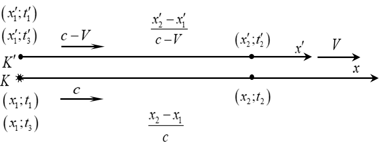 1) Условия одновременности: \(t_1=t_2\) эквивалентны формулировке: \(\displaystyle t_3=t_1+{x_2-x_1\over c}\)