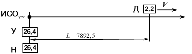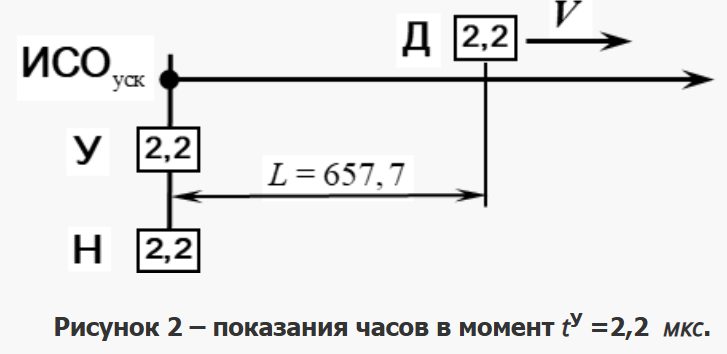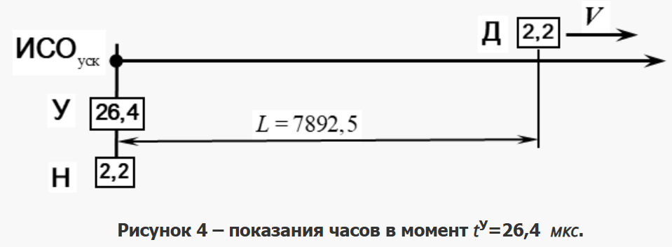 В момент, когда часы Д отсчитают отрезок собственного времени \(\Delta t^Д_{соб}=2,2\) мкс, неподвижные в эфире часы У отсчитают отрезок собственного времени 26,4 мкс, за который движущиеся часы Д переместятся на расстояние \(L=26,4\cdot V=7895,2\) м – см. рисунок 4.