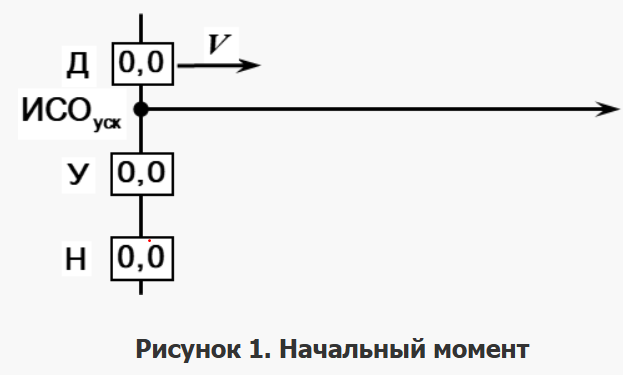 Остановленные часы Д в эксперименте были предварительно разогнаны до скорости V и в начальный момент были запущены одновременно с часами У и Н, т. е. все трое часов начали свой отсчет времени от 0.