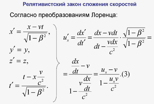 Эти выражения выводятся из ПЛ и называются формулами сложения скоростей в релятивистской механике.