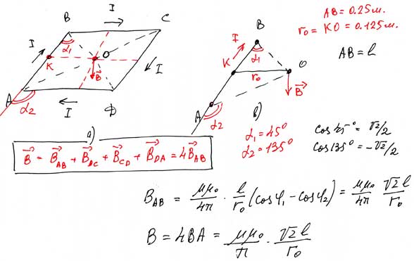Проводник с током 4А и длиной 1м согнут в виде квадрата. Определить индукцию и напряженность магнитного поля в точке пересечения диагоналей квадрата. Решение пояснить чертежом.