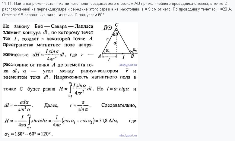 Представим себе бесконечно длинный провод и мы из точки С (как на рисунке) наблюдаем за малым отрезком dl, если его сместить бесконечно далеко вправо от точки В - он будет виден под углом 1800, если бесконечно далеко влево за точку А - будет виден под углом 00. переход к конечному отрезку очевиден. Можно посмотреть http://alexandr4784.narod.ru/sav2.htm §41. Поля прямого и кругового токов