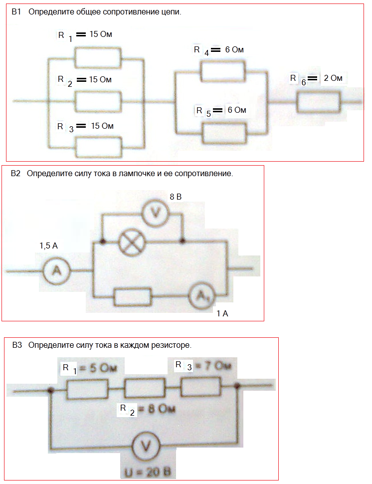 B3. здесь у нас последовательное соединение. ток тут опять как вода, только теперь он не делится нигде (нет разветвлений) и везде одинаковый. значит, найдем общее сопротивление и рассчитаем этот ток, и это и будет ответ