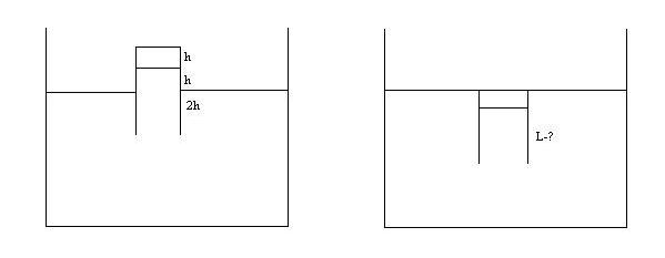 Цилиндрическая пробирка длиной 4h, содержащая некоторое количество газа, погружается открытым концом до половины своей длины в жидкость с плотность р. При этом оказывается, что поверхность жидкости внутри пробирки находится на расстоянии 3h от ее открытого конца. В каком положении будет находиться жидкость в пробирке при полном погружении последней? Температура во время опыта поддерживается постоянной, наружное давление равно Р.