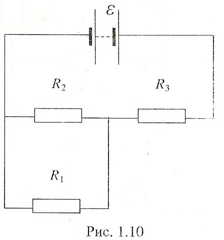В схеме рис. 1.10 ЭДС батареи E =120 В, сопротивления R1=25 Ом,R2=R3=100 Ом. Найти мощность Р1, выделяющуюся на сопротивлении R1. Сопротивлением батареи пренебречь.