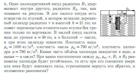 я расставил силы, действующие на поршень: силу гидростатического давления, тяжести, две силы архимеда. учел то, что поршень находится частично в воде, частично в масле. высоту столбика воды тоже записал правильно. но ответ получается неверный. может, я не учитываю какую нибудь силу? помогите разрешить вопрос