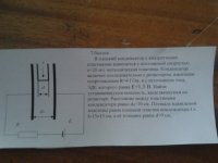 где Е - ЭДС, е0 - электрическая постоянная, S - площадь обкладок, d - ширина пластины, d0 расстояние между обкладками конденсатора, R - сопротивление, t - время пролета (3/400 с из соображений кинематики v = s/t)
