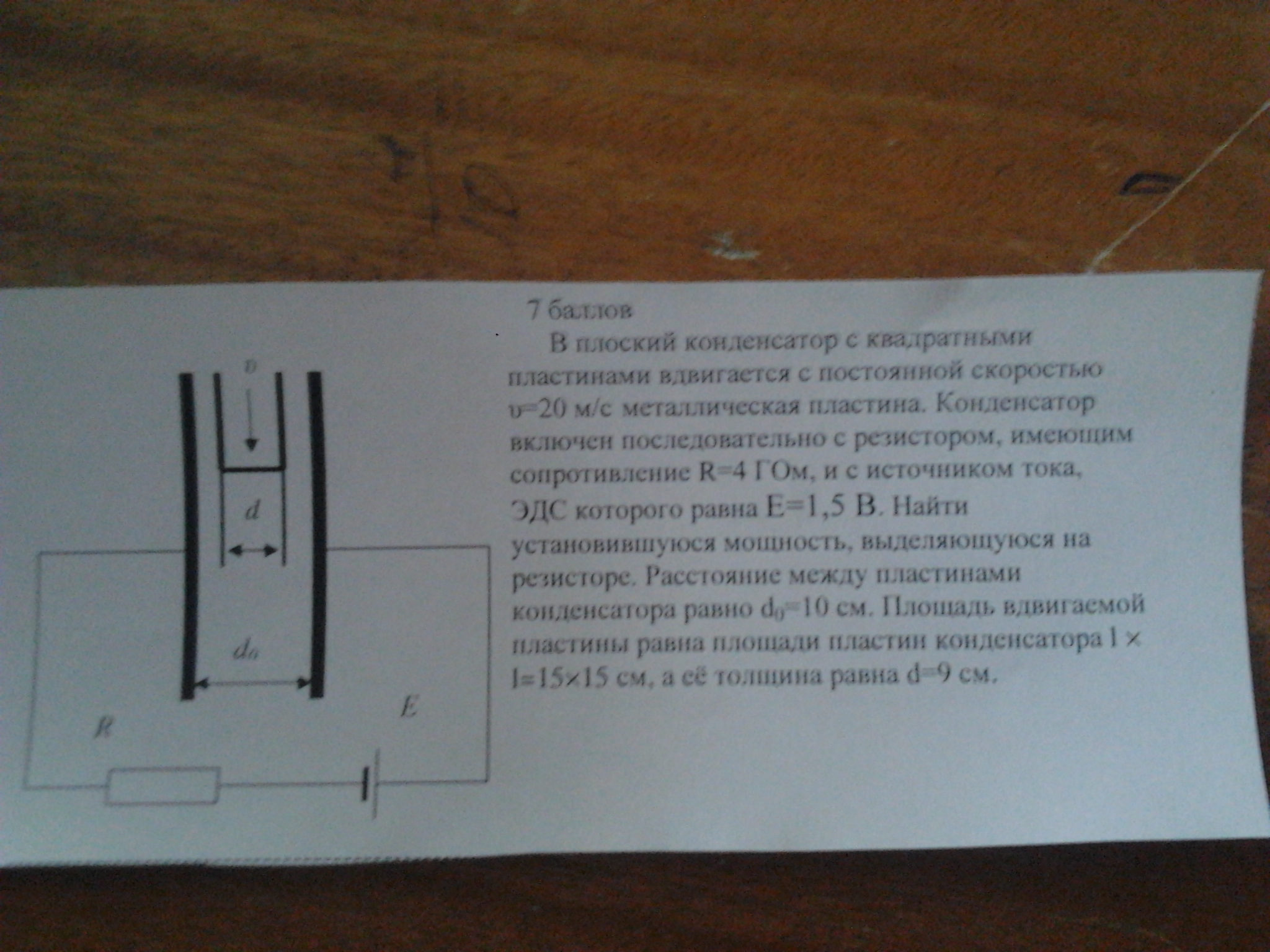 В плоский конденсатор с квадратными пластинами вдвигаетсяс постоянной скоростью v=20 м\с металлическая пластина.Конденсатор включен последовательно с резистором,имеющим сопротивление R=4 ГОм, и с источником тока, ЭДС которого равна Е=1,5 В. Найти установившуюся мощность, выделяющуюся на ризисторе. Расстояние между пластинами конденсатора равно d=10 см. Площадь вдвигаемой пластины равна площади пластины конденатора1x1=15x15 см, а ее толщина равна d=9см.
