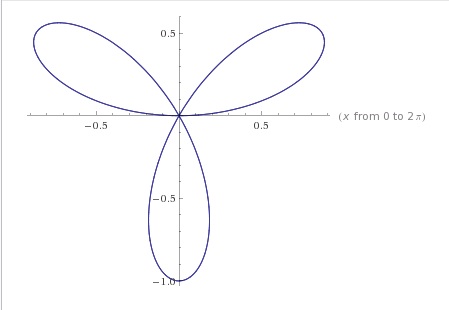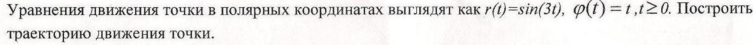 Траектория движ. точки в полярных коор Автор Сообщение Ostrova #11685 2012-09-09 19:49 GMT Пользователи 3 сообщений Репутация 0 [-][+] 1) Уравнения движения точки в полярных координатах выглядят так: r(t)=sin(3t), Фи(t)=t, t>0 Построить траекторию движения точки Помогите, пожалуйста) Личное сообщение владик #11686 2012-09-09 22:29 GMT Модераторы 807 сообщений Кто: владик Возраст: 29 Репутация 50 [-][+] ты выводишь зависимость радиальной координаты от угловой координаты, получаешь траекторию в полярных координатах. r(t)=sin(3t), Фи(t)=t r(Фи) = sin(3Фи) это трилистник) Нет границ, а есть лишь препятствия! И каждое препятствие можно преодолеть! Личное сообщение ФорумыФизика » МеханикаФизика » Молекулярная физика и ТермодинамикаФизика » ЭлектродинамикаФизика » Колебания и волныФизика » ОптикаФизика » Физика атомов и молекулФизика » Элементы СТОФизика » Решение задач по физикеФизика » АстрономияОбщее » Наш сайтОбщее » Простые разговорыОбщее » Web-ресурсыОбщее » Альтернативные теории