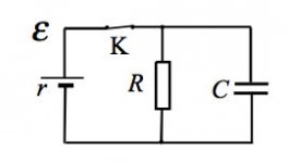 В электрической схеме, показанной на рисунке, ключ К замкнут. ЭДС батарейки - 24 В. Сопротивление резистора R=25 Ом, заряд конденсатора 2 мкКл. После размыкания ключа К в результате разряда конденсатора на резисторе выделяется кол-во теплоты 20 мкДж. Найти внутренне сопротивление батарейки r.