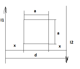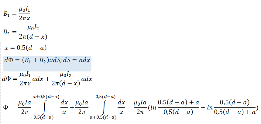 ]По проводникам двухпроводной линии идет ток I=2 А, расстояние между осями провода d=8см, определите поток магнитной индукции Ф, пронизывающий квадратную рамку со стороной а=5 см, расположенную в одной плоскости с линией.