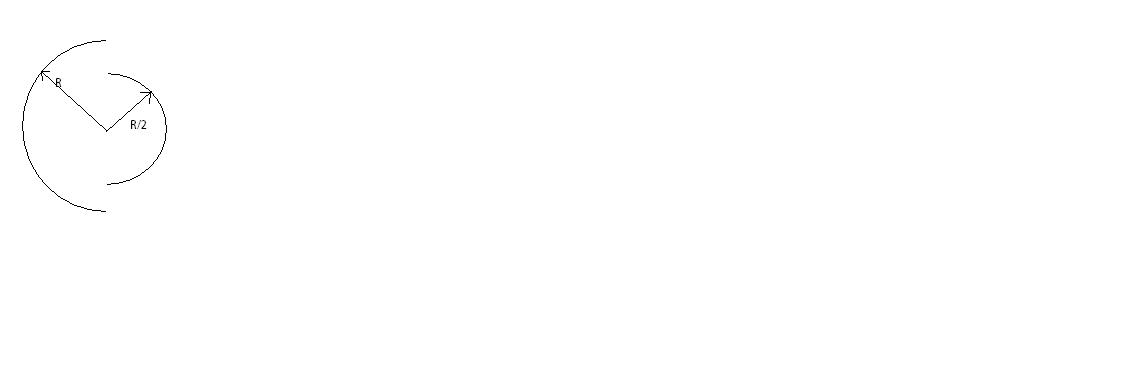 Электрическое поле создано двумя равномерно заряженными с линейной плотностью {\tau _1} = {\tau _2} = 10 мкКл/м нитями, расположенными в одной плоскости и изогнутыми в виде полуколец. Считая радиусы R и R/2, найти потенциал поля в центре окружностей
