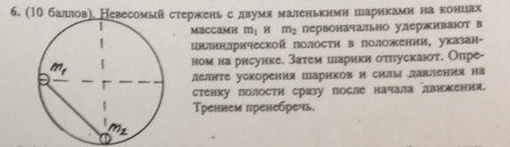 Невесомый стержень с двумя маленькими шариками на концах массами m1 и m2 первоначально удерживают в цилиндрической полости в положении, указанном на рисунке. Затем шарики отпускают.Определите ускорения шариков и силы давления на стенку полости сразу после начала движения. Трением пренебречь.21127-1418500001_xxexsxjxxu.png . Расписал второй закон Ньютона , но не понимаю какие силы действуют со стороны стержня на шарик