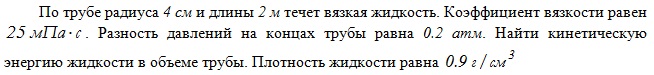 С объёмом разобрался, кажется: V = 1/3*Пи*L*( R^2 + rR + r^2 ). Осталась 8 ... Ещё вопрос появился. В формуле Пуазейля радиус один, следовательно нам важно знать из какого конца жидкость вытекает, ведь так? Иначе какой тогда радиус брать? И тогда не понимаю, вопрос в задаче поставленный: найти кин. энергию внутри трубки, получается и радиусы здесь не важны вовсе? В общем, каша в голове, наверное, не понимаю и границы применимости тогда закона Пуазейля. Если вам не трудно, Count_May, развейте сей туман незнания.