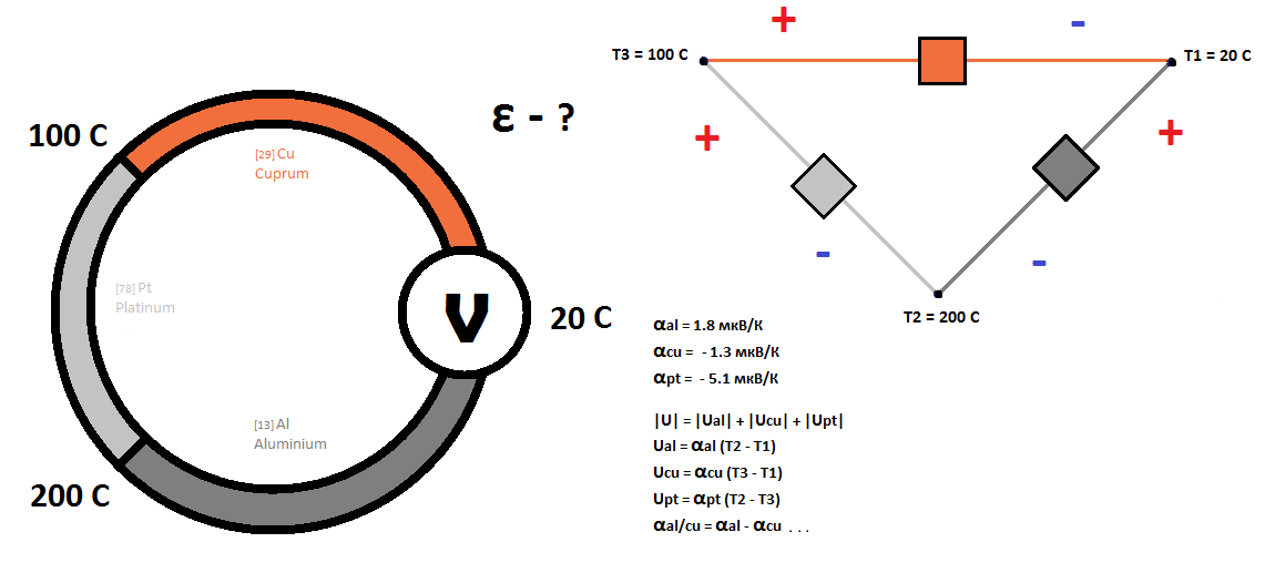 Нашёл в одной тетрадке задачу, условие короткое: кольцо из спаянных алюминия, меди и платины; между алюминием и медью включён вольтметр; найти показания вольтметра. Я перерисовал тетрадные рисунки и решение, но сомневаюсь в его правильности, т.к. не понимаю, что такое \(\alpha\)al, \(\alpha\)cu, \(\alpha\)pt; единицы измерения соответствуют коэффициенту термопары, но термопара - это ведь al/cu, а не отдельные al и cu. Буду благодарен, если кто-нибудь прояснит, что к чему.