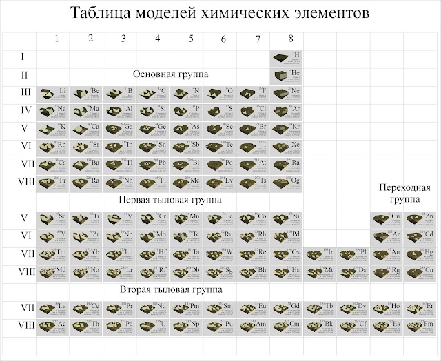 На таблице моделей химических элементов можно выделить группы, с характерным распределением одинаковых свойств, которые строго отличаются друг от друга это группы: