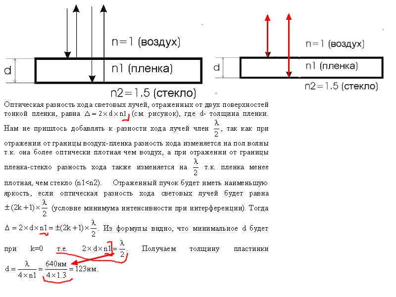 . Потеря полуволны происходит при отражении как от пленки, так и от стекла (показатель преломления стекла больше, чем пленки), поэтому, эту потерю можно не учитывать. Следовательно,